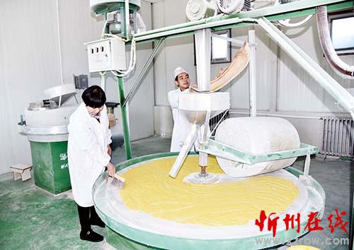 代縣南北兩半坡所產(chǎn)的小米,由于地理環(huán)境特殊,無(wú)霜期長(zhǎng),光照充足,晝夜溫差大,不僅色澤金黃品質(zhì)優(yōu),而且口感好,久負(fù)盛名,十分走俏。該公司用石碾加工小米,以散裝每公斤14元、高檔包裝每公斤16元出售,銷往北京、太原等地。圖為公司員工用石碾加工小米(石俊文 劉睿)