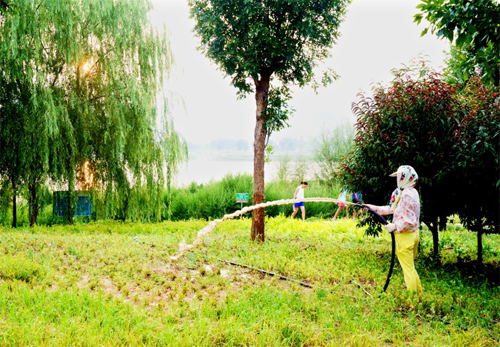 8月5日,河曲縣綠化工正在利用水泵汲取黃河水澆灌綠植。連日來,持續(xù)的高溫晴熱天氣,導致綠化植物普遍出現(xiàn)旱情。為此,該縣動用水車、抽水泵等設(shè)備,多方調(diào)水,加大澆灌力度,推進抗旱保綠。(賈金理 攝)