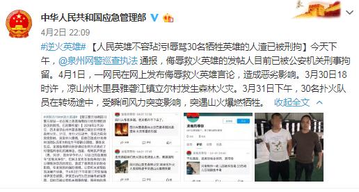 4月2日晚十時許,中華人民共和國應(yīng)急管理部通報了該事件,并稱“人民英雄不容玷污!辱罵30名犧牲英雄的人渣已被刑拘”。