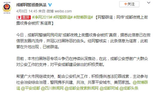 4月8日,成都網(wǎng)警對此辟謠稱:接網(wǎng)民問詢“成都夜晚上街露紋身會被抓”真假,據(jù)悉此信息已在微信朋友圈內(nèi)流傳,并冠以掃黑除惡的由頭。經(jīng)網(wǎng)警核實,此條信息為謠言,此前曾在外地出現(xiàn),已被辟謠。目前,本市掃黑除惡專項斗爭仍在持續(xù)縱深推動,在此,成都公安感謝廣大群眾對公安工作的支持,對平安成都建設(shè)做出的積極貢獻(xiàn)。希望廣大市民繼續(xù)支持、配合公安機(jī)關(guān)工作,積極提供違法犯罪線索,主動參與社會治安綜合治理,警民攜手共建、共治、共享平安城市、美麗家園。