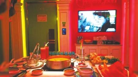 位于成都青羊區(qū)的一家KTV,旗幟鮮明地打起了“火鍋KTV”的招牌?!?葷5素,線上直接下單,火鍋直接送進(jìn)包廂。”工作人員正在向顧客介紹。