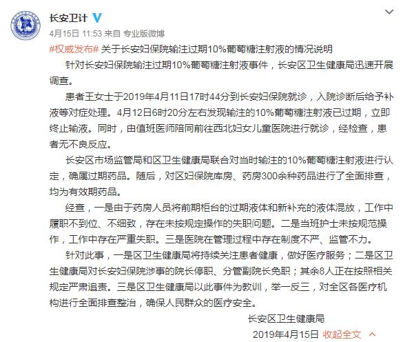 長(zhǎng)安區(qū)市場(chǎng)監(jiān)管局和區(qū)衛(wèi)生健康局聯(lián)合對(duì)當(dāng)時(shí)輸注的10%葡萄糖注射液進(jìn)行認(rèn)定,確屬過期藥品。隨后,對(duì)區(qū)婦保院庫房、藥房300余種藥品進(jìn)行了全面排查,均為有效期藥品。