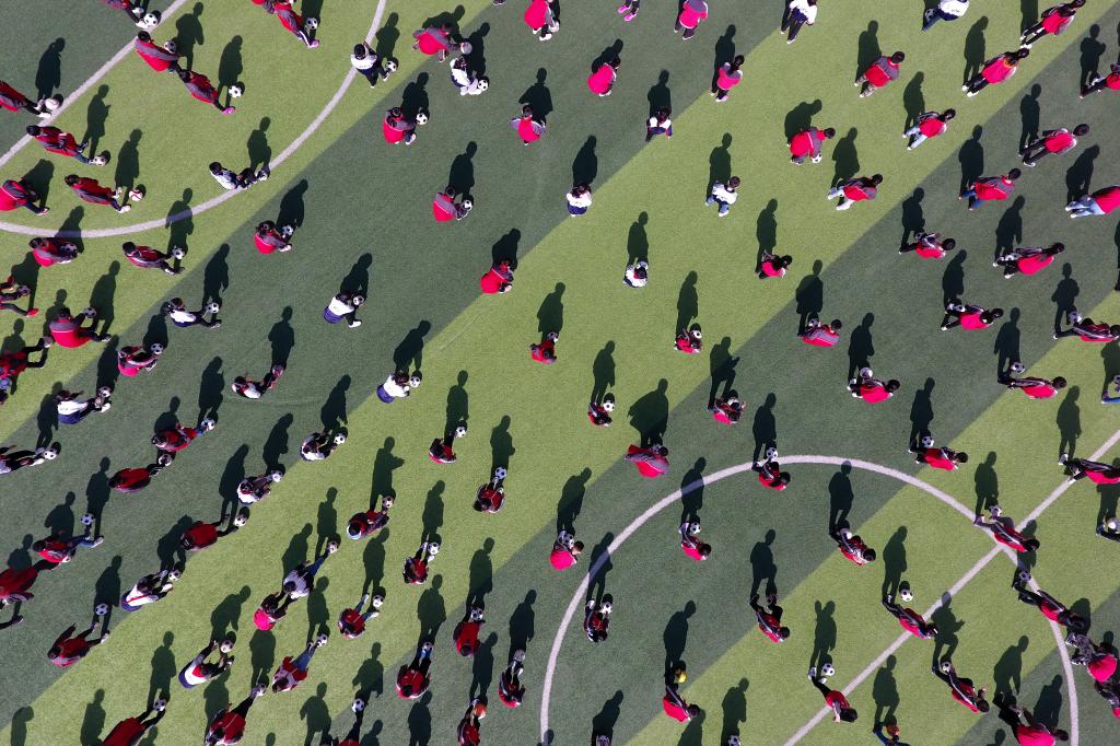 ↑這是學(xué)生們在做足球操(4月16日無人機(jī)拍攝)。新華社記者詹彥攝