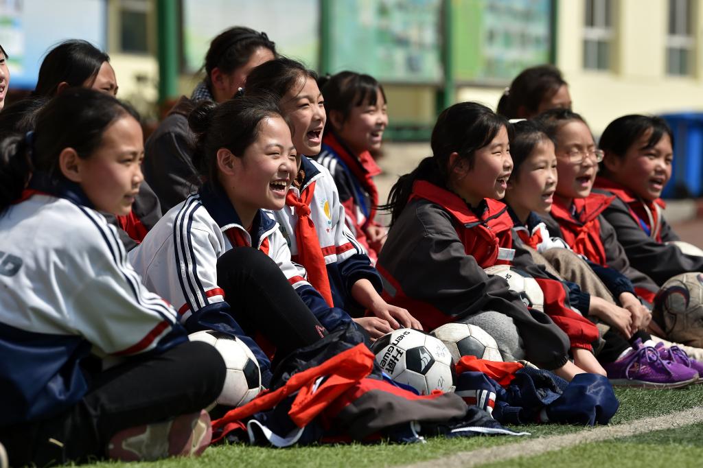↑這是初一119班的足球隊(duì)隊(duì)員在球場上合影(4月16日攝)。新華社記者詹彥攝