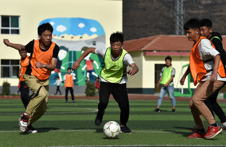 ↑這是初中組男子足球隊(duì)隊(duì)員在進(jìn)行分組對(duì)抗賽(4月17日攝)。新華社記者詹彥攝