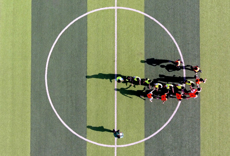 ↑這是初中組男子足球隊(duì)隊(duì)員在分組對(duì)抗賽開始前互相擊掌(4月17日無人機(jī)拍攝)。新華社記者詹彥攝