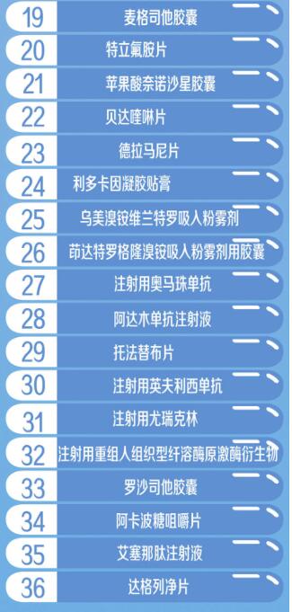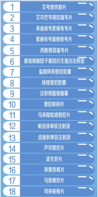 國(guó)家醫(yī)保局醫(yī)藥服務(wù)管理司司長(zhǎng)熊先軍介紹,此次談判成功的藥品多為近年來(lái)新上市且具有較高臨床價(jià)值的藥品,涉及癌癥、罕見(jiàn)病、風(fēng)濕免疫、心腦血管、消化等10余個(gè)臨床治療領(lǐng)域。重點(diǎn)領(lǐng)域的5個(gè)基本藥物全部談判成功,22個(gè)抗癌藥、7個(gè)罕見(jiàn)病用藥、14個(gè)慢性?。ê悄虿?、乙肝、風(fēng)濕性關(guān)節(jié)炎等)用藥、4個(gè)兒童用藥談判成功,進(jìn)一步優(yōu)化了目錄結(jié)構(gòu)。