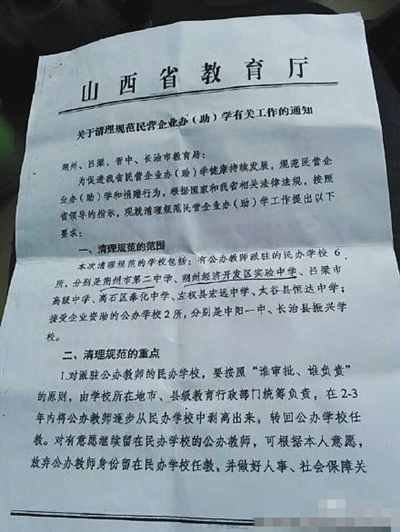 新京報記者看到,文件名為《關(guān)于清理規(guī)范民營企業(yè)辦(助)學有關(guān)工作的通知》,加蓋有山西省教育廳公章。文件中明確提出,“在2-3年內(nèi)將公辦教師逐步從民辦學校中剝離岀來,轉(zhuǎn)回公辦學校任職?!?/p>