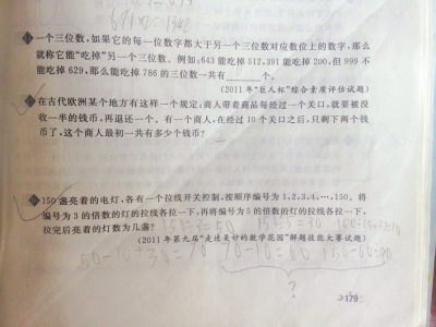 “150盞亮著的電燈,各有一個(gè)拉線開關(guān)控制,被順序編號(hào)為1,2,3,4,…,150。將編號(hào)為3的倍數(shù)的燈的拉線各拉一下,再將編號(hào)為5的倍數(shù)的拉線各拉一下,拉完后亮著的燈數(shù)為幾盞?”這是一道考公因數(shù)和公倍數(shù)的思維數(shù)學(xué)題,今年暑假,才上完三年級(jí)的羅弋在做四年級(jí)的數(shù)學(xué)競(jìng)賽題集《培優(yōu)新幫手》時(shí)遇到此題,算出答案“90”與標(biāo)準(zhǔn)答案“80”不符,媽媽陳群只當(dāng)兒子錯(cuò)了。