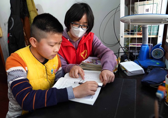 疫情之下,停課不停學。家住安徽省合肥市廬江縣廬城鎮(zhèn)繡溪社區(qū)陽光花園小區(qū)的錢自豪是一名初一學生,他家迎來了一位“臨時”老師,是來自安徽農(nóng)業(yè)大學2017級的大學生志愿者朱婧(右)。周躍東/攝