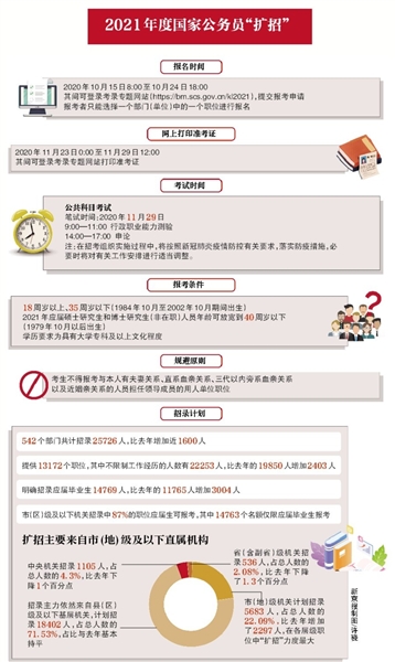 昨日,國家公務員局發(fā)布公告,今日8時起至10月24日18時,可報名中央機關及其直屬機構(gòu)2021年度考試。542個部門共計招錄25726人,比去年增加近1600人。明確招錄應屆畢業(yè)生14769人,比去年增加3004人。