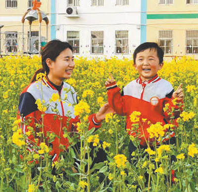 河北省大名縣黃金堤鄉(xiāng)金鄉(xiāng)水岸幼兒園老師給孩子講解油菜花。人民日?qǐng)?bào)記者 張騰揚(yáng)攝