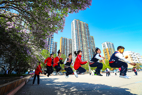 4月25日,沈陽(yáng)市和睦路小學(xué)的孩子們?cè)谶M(jìn)行快樂(lè)大課間活動(dòng)。該校保證學(xué)生每天有不少于1小時(shí)的體育鍛煉時(shí)間。視覺(jué)中國(guó)供圖