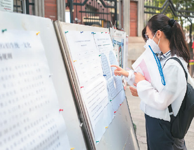 二○二二年七月七日,二○二二年上海市普通高等學(xué)校招生統(tǒng)一文化考試開考,五萬多名考生奔赴考場(chǎng)。圖為上海格致中學(xué)考點(diǎn),考生查看考場(chǎng)信息。 王 初攝(人民視覺)