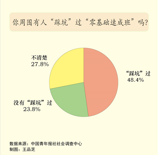 調(diào)查中,48.4%的受訪者表示周圍有人踩過(guò)“零基礎(chǔ)速成班”的坑,23.8%的受訪者表示沒有,27.8%的受訪者不清楚。