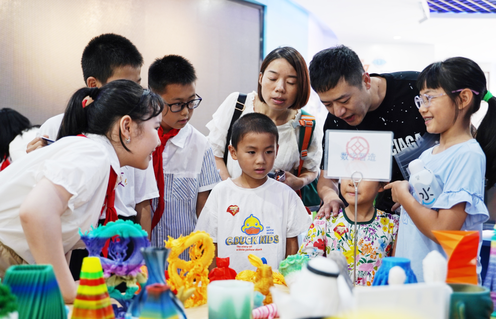 成都七中初中附屬小學一年級新生在學校人工智能館觀看3D打印機打印的作品。新華社記者邢拓 攝