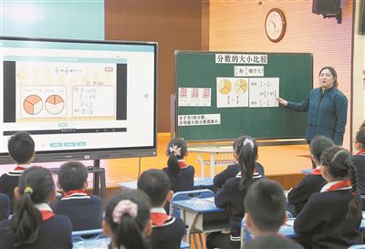在上海市楊浦區(qū)平?jīng)雎返谌W的“教學助手”展示課上,老師在黑板上進行知識點講解分析,顯示屏上有學生們的人機互動結(jié)果和學習效果的統(tǒng)計數(shù)據(jù)。 新華社記者 劉穎攝