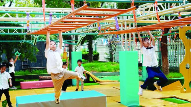 常州市五星幼兒園的負(fù)責(zé)人王艷表示,有一次同事將幾條外國(guó)幼兒園、小學(xué)低年級(jí)年齡段孩子進(jìn)行體能訓(xùn)練的視頻發(fā)了過來,視頻上的孩子能夠完成跳鞍馬、手倒立行走等動(dòng)作。“于是,我們結(jié)合孩子們的意見,邀請(qǐng)專家共同繪制賽道構(gòu)思圖,將平衡、走、跑、跳、攀爬、懸掛等動(dòng)作元素融為一體,打造出一個(gè)綜合性的體能游戲賽道?!?/p>