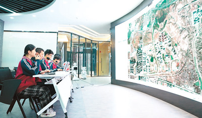 學(xué)生在學(xué)校低空空域管控服務(wù)中心進(jìn)行無人機(jī)飛行作業(yè)的航線規(guī)劃、飛行任務(wù)管理。