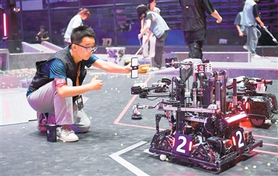 5月21日至5月25日,全國大學生機器人大賽——RoboMaster2025機甲大師超級對抗賽·區(qū)域賽(中部賽區(qū))在湖南省長沙市舉行。圖為合肥工業(yè)大學蒼穹戰(zhàn)隊隊員在比賽間隙調(diào)試機器人。新華社記者 陳振海攝