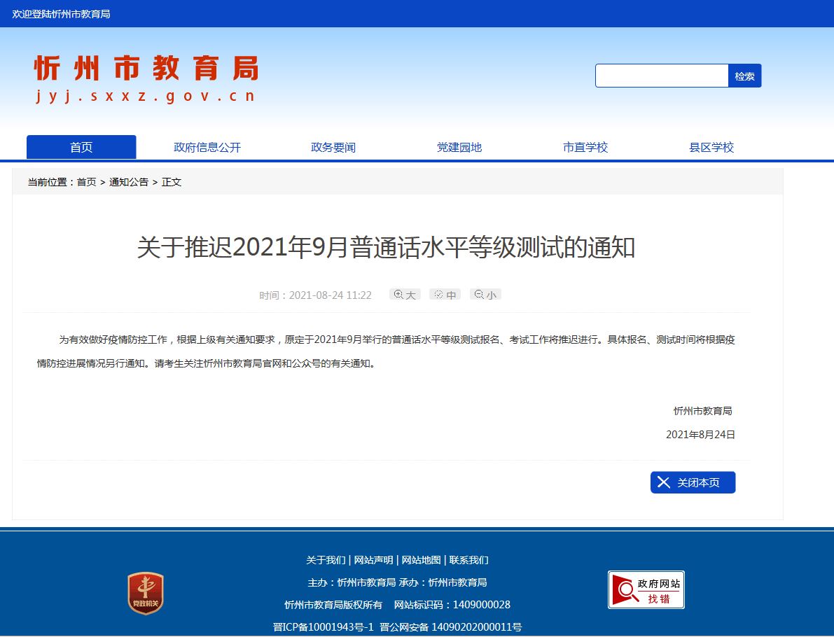 忻州市教育局關(guān)于推遲2021年9月普通話水平等級測試的通知