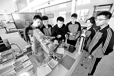 2023年3月28日,在河北省興隆縣職教中心,學生正進行工業(yè)機器人應用實訓。 新華社發(fā)