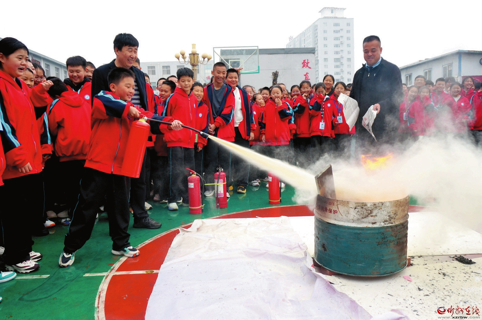 為了提升學(xué)?;馂?zāi)疏散組織和管理能力,強(qiáng)化師生安全意識(shí),培養(yǎng)師生的自救能力,10月31日,忻州市第七中學(xué)舉行消防應(yīng)急疏散演練。圖為學(xué)生使用滅火器滅火。(張卯芳 攝)