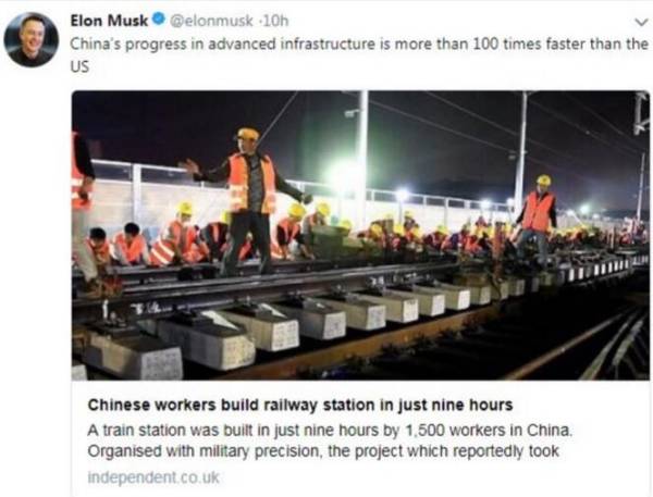 央廣網(wǎng)北京2月28日消息 近年來,中國速度日益引發(fā)外媒關(guān)注。今天(28日),一段中國工人在火車站施工的視頻又走紅美國,剛剛將跑車送上太空的企業(yè)家馬斯克(Elon Musk)也忍不住轉(zhuǎn)發(fā)贊嘆,“中國先進(jìn)基礎(chǔ)設(shè)施發(fā)展速度比美國快了100多倍”。