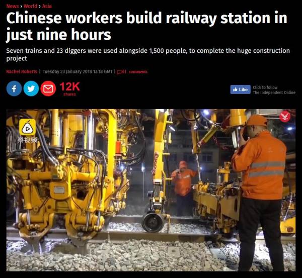 報(bào)道以《中國工人建火車站只要9個(gè)小時(shí)》為標(biāo)題,并稱中國的先進(jìn)基建工程讓人“嘆為觀止”。