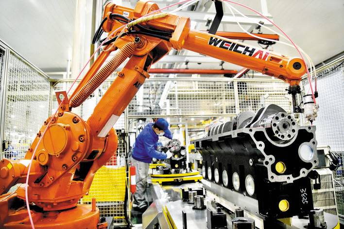 在位于山東濰坊的濰柴集團(tuán)一號工廠總裝車間,工人們在流水線上裝配發(fā)動機(jī)(3月19日攝)。 3月31日,國家統(tǒng)計局服務(wù)業(yè)調(diào)查中心、中國物流與采購聯(lián)合會發(fā)布數(shù)據(jù),3月份,中國制造業(yè)采購經(jīng)理指數(shù)(PMI)為52%,比上月回升16.3個百分點。 新華社記者 郭緒雷 攝 (責(zé)任編輯:盧相?。?/p> |