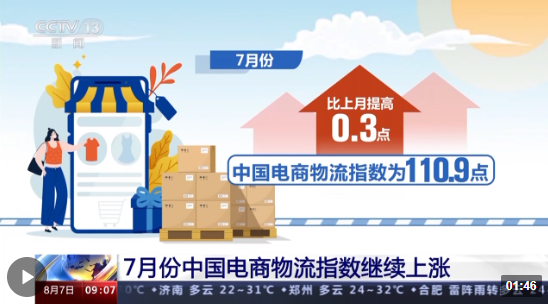 中國(guó)物流與采購(gòu)聯(lián)合會(huì)今天(7日)公布了7月份中國(guó)電商物流指數(shù)。受益于供給端各項(xiàng)指數(shù)的穩(wěn)步上漲,中國(guó)電商物流指數(shù)較上月有所提高,繼續(xù)保持連續(xù)上漲態(tài)勢(shì)。