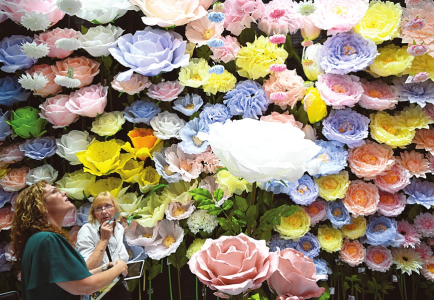 圖為廣交會(huì)會(huì)場(chǎng)的境外采購(gòu)商在仿真花展臺(tái)洽談。