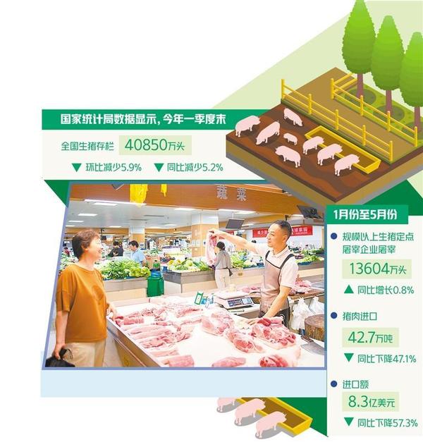 國家統(tǒng)計(jì)局?jǐn)?shù)據(jù)顯示,今年一季度末,全國生豬存欄40850萬頭,環(huán)比減少5.9%,同比減少5.2%。一季度,全國生豬出欄19455萬頭,同比下降2.2%;豬肉產(chǎn)量1583萬噸,同比下降0.4%。5月末能繁母豬存欄3996萬頭,環(huán)比增長0.2%,同比下降6.2%。1月份至5月份規(guī)模以上生豬定點(diǎn)屠宰企業(yè)屠宰13604萬頭,同比增長0.8%。2月份開始屠宰量低于上年同期,5月份規(guī)模以上生豬定點(diǎn)屠宰企業(yè)屠宰2666萬頭,同比下降5.0%。