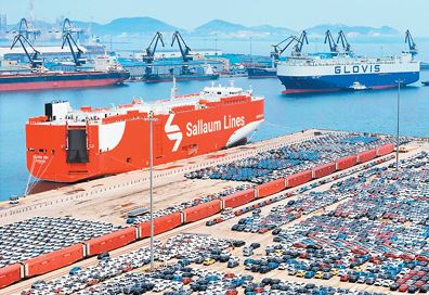 8月6日,在山東港口煙臺(tái)港,滾裝船在裝運(yùn)外貿(mào)車(chē)輛(無(wú)人機(jī)照片)。唐 克攝(新華社發(fā))