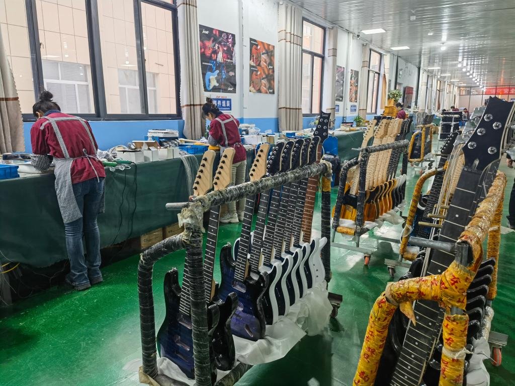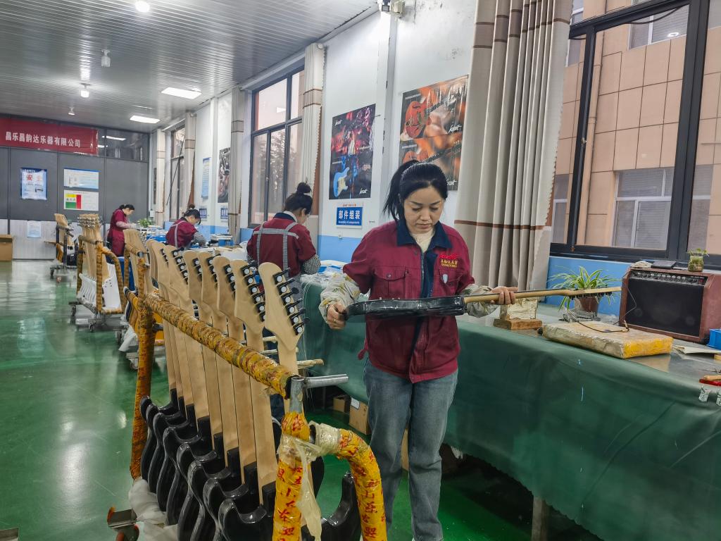 今天的鄌郚鎮(zhèn),總?cè)丝诓贿^8萬,卻有5000多人從事樂器產(chǎn)業(yè),年人均工資收入8萬元左右。電吉他等樂器生產(chǎn)成為當(dāng)?shù)鼐用褡钪匾氖杖雭碓础?/p>
