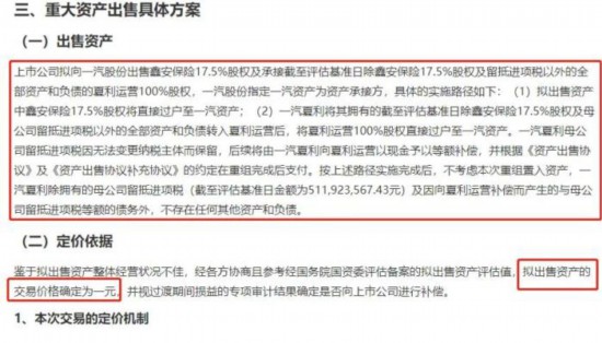 鑒于擬出售資產(chǎn)整體經(jīng)營狀況不佳,經(jīng)各方協(xié)商且參考經(jīng)國務(wù)院國資委評估備案的擬出售資產(chǎn)評估值,一汽夏利擬出售資產(chǎn)的交易價格確定為1元。