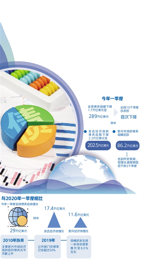 日前,國際金融協(xié)會(huì)發(fā)布了最新的全球債務(wù)監(jiān)測(cè)報(bào)告。好消息是全球債務(wù)規(guī)模在2021年一季度出現(xiàn)10個(gè)季度以來的首次下降;壞消息是全球債務(wù)規(guī)模體量巨大、償債能力不均衡等問題依然存在。