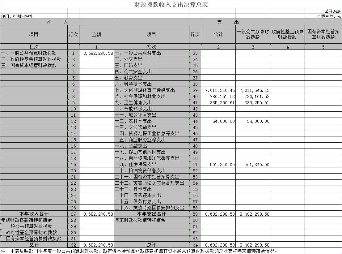 2021年度財政撥款收入總計868.23萬元、支出總計868.23萬元。與上年相比,財政撥款收入總計增加51.28萬元,增加5.9%,財政撥款支出總計增加51.28萬元,增加5.9%。主要原因是工資增加。