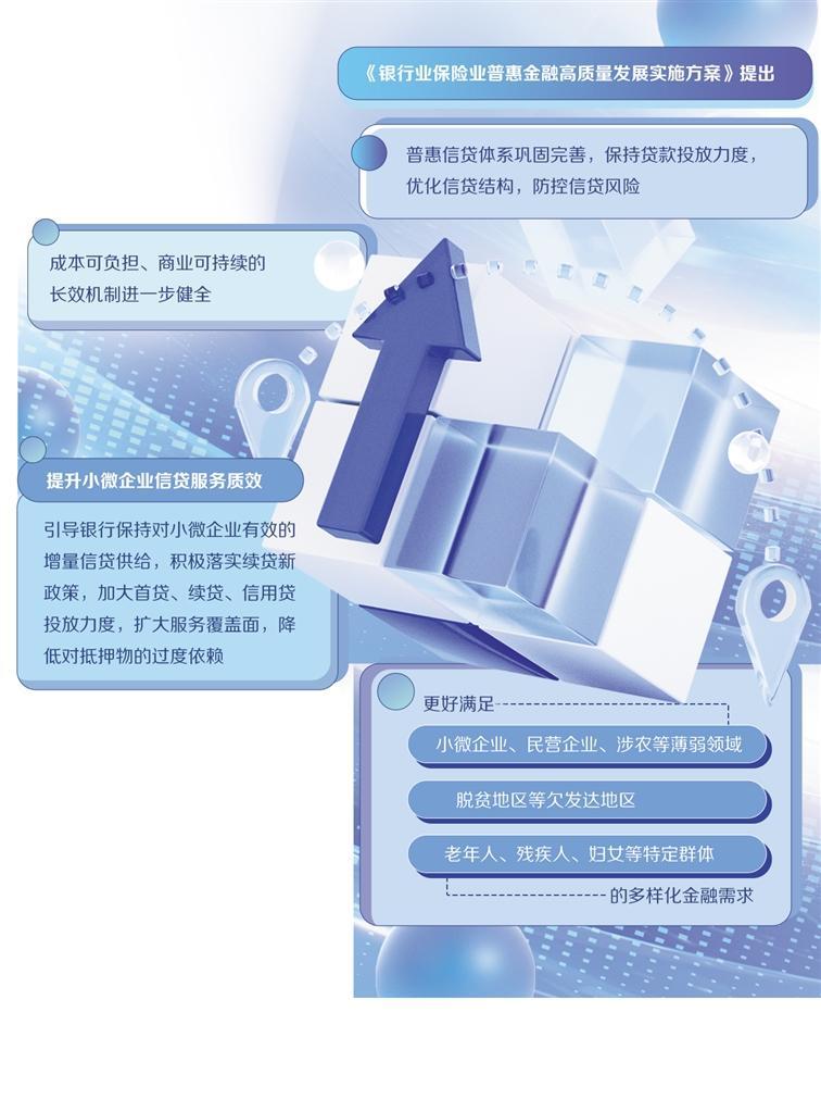 近年來,我國(guó)普惠金融發(fā)展取得長(zhǎng)足進(jìn)步,金融服務(wù)的普惠性不斷提升。近期印發(fā)的《銀行業(yè)保險(xiǎn)業(yè)普惠金融高質(zhì)量發(fā)展實(shí)施方案》(以下簡(jiǎn)稱《實(shí)施方案》)在主要目標(biāo)中提出,普惠信貸體系鞏固完善,保持貸款投放力度,優(yōu)化信貸結(jié)構(gòu),防控信貸風(fēng)險(xiǎn),成本可負(fù)擔(dān)、商業(yè)可持續(xù)的長(zhǎng)效機(jī)制進(jìn)一步健全,更好滿足小微企業(yè)、民營(yíng)企業(yè)、涉農(nóng)等薄弱領(lǐng)域,脫貧地區(qū)等欠發(fā)達(dá)地區(qū)以及老年人、殘疾人、婦女等特定群體的多樣化金融需求。