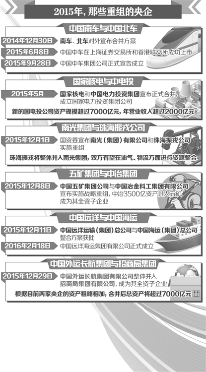 2015年,央業(yè)重組邁出重要步伐。有6對(duì)12家企業(yè)完成了重組,涉及至少27家上市公司,一批包括裝備制造、能源、航運(yùn)在內(nèi)的央企實(shí)現(xiàn)兼并重組,中央企業(yè)也由112家減至106家。2016年以來,繼1月25日中材集團(tuán)與中建集團(tuán)發(fā)布公告稱實(shí)施戰(zhàn)略重組之后,中國國旅集團(tuán)與中國港中旅集團(tuán)也發(fā)布公告稱籌劃戰(zhàn)略重組。此外,中航動(dòng)力、成發(fā)科技、中航動(dòng)控三家公司則于日前發(fā)布重組公告。離國務(wù)院國資委直接監(jiān)管的中央企業(yè)數(shù)量減至100家僅有“一步之遙”。