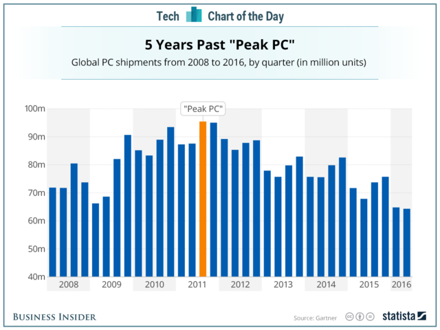 英特爾所有的改變?cè)醋匀找嫖s的PC市場(chǎng)。美國投資銀行Bernstein分析師斯塔西雷斯根(Stacy Rasgon)表示,PC芯片是英特爾最大的營收來源,但其最終意識(shí)到,在PC行業(yè)不景氣的新常態(tài)下,必須尋找其他創(chuàng)收增長(zhǎng)引擎。