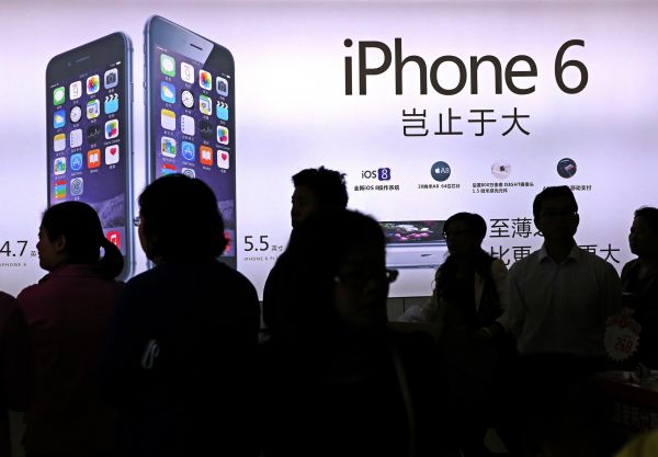 2014年10月17日,顧客在江西南昌的一家蘋(píng)果授權(quán)經(jīng)銷(xiāo)店門(mén)口排隊(duì),等待購(gòu)買(mǎi)iPhone6和iPhone6 Plus手機(jī)。 (新華社發(fā))