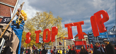 自2013年歐盟和美國啟動(dòng)《跨大西洋貿(mào)易與投資伙伴關(guān)系協(xié)定》(TTIP)談判以來,歐洲國家的反對(duì)和抗議聲不絕于耳。圖為今年4月,德國民眾走上街頭抗議TTIP談判。