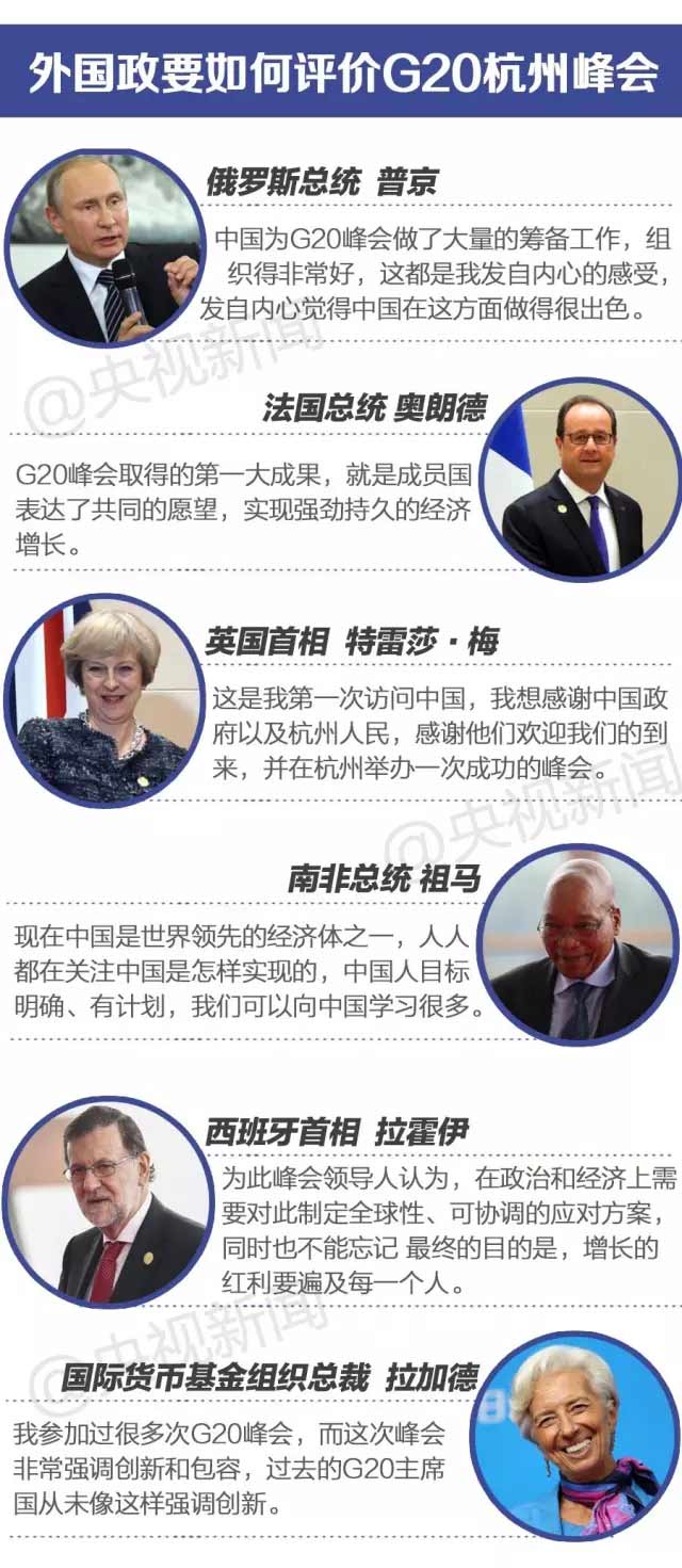 各方高度贊揚杭州峰會的共識,感謝中國舉辦會議的付出。一些與會領(lǐng)導(dǎo)人還肯定了中國的發(fā)展成就以及中國經(jīng)濟發(fā)展對全球經(jīng)濟的影響,明確表示愿與中國加強合作的意愿。杭州峰會使G20進入升級版,使中國成為G20中舉足輕重的角色。