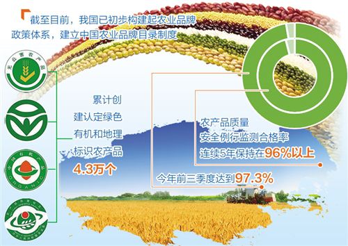 “中國農業(yè)品牌正駛入快速健康發(fā)展的快車道,成為現(xiàn)代農業(yè)發(fā)展的亮麗風景。”農業(yè)農村部部長韓長賦表示,近年來我國大力實施品牌強農戰(zhàn)略,取得了積極成效。截至目前,已初步構建起農業(yè)品牌政策體系,建立中國農業(yè)品牌目錄制度。累計創(chuàng)建認定綠色有機和地理標識農產品4.3萬個,形成了一批特色地域名片。品牌化帶動了農業(yè)生產標準化,農產品質量安全例行監(jiān)測合格率連續(xù)5年保持在96%以上,今年前三季度達到97.3%,更多優(yōu)質農產品受到消費者青睞。