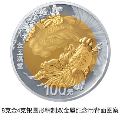 8克金4克銀圓形雙金屬紀(jì)念幣背面圖案為金魚與海棠花等組合圖案,并刊“金玉滿堂”字樣及面額。
