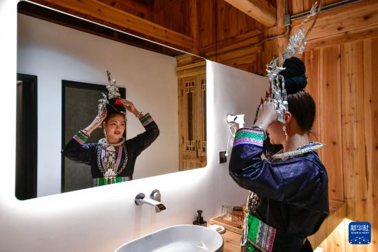 3月17日,村民在貴州省榕江縣栽麻鎮(zhèn)大利侗寨月亮山居民宿里整理銀飾。