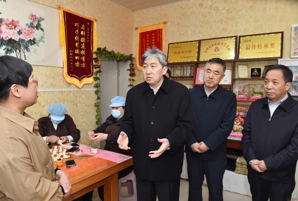 非遺傳承人李紅霞主要從事面塑工藝品和花饃制作與銷售工作,由她創(chuàng)辦的紅霞鄉(xiāng)情守藝坊,吸收了當地無業(yè)和老弱病殘人員20余人。走訪中,朱曉東來到李紅霞處,詳細了解面塑的歷史、現狀、未來發(fā)展方向,詢問她在經營、培訓、傳承中存在的困難和問題。朱曉東指出,非遺傳承人是非物質文化遺產重要的承載者和傳承者,在傳統文化和民間藝術的延續(xù)發(fā)展中發(fā)揮著關鍵性作用。要積極主動為傳承人搭建展示推廣平臺,讓珍貴的傳統技藝有序、有效傳承下去。希望傳承人進一步堅定文化自信,結合時代發(fā)展的特點,不斷推陳出新,做好產品研發(fā)和創(chuàng)新,注重實用價值轉化,在宣傳、品質、特色和工業(yè)化、標準化方面下功夫,開展好授徒傳藝,賦予非遺項目新的活力,將“小花饃”產業(yè)做大做強。