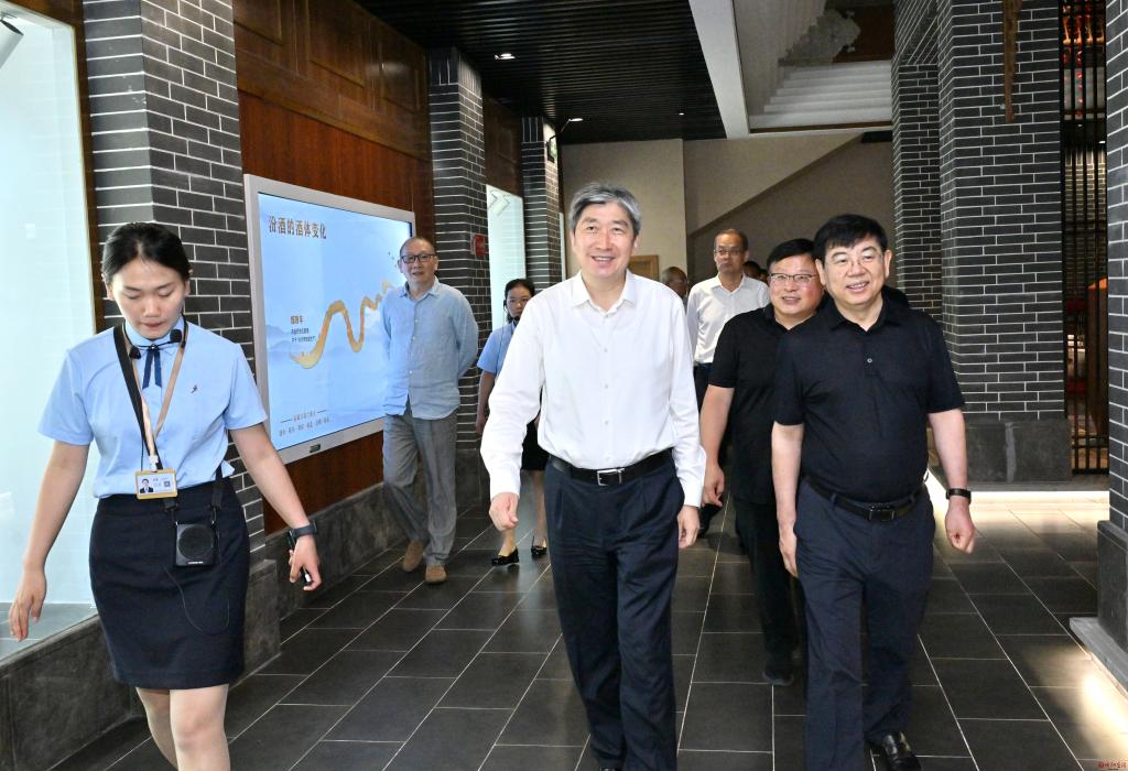 在中國汾酒城,朱曉東一行登上西城樓,俯瞰酒城全貌,聽取汾酒城的建設(shè)規(guī)模、生產(chǎn)經(jīng)營、產(chǎn)品銷售等情況介紹。隨后,朱曉東一行走進汾酒博物館,通過館陳文物、文獻史料、文人墨寶等,切身感受汾酒集團的企業(yè)文化,了解企業(yè)歷史沿革、技術(shù)創(chuàng)新及汾酒的釀造技藝等情況。