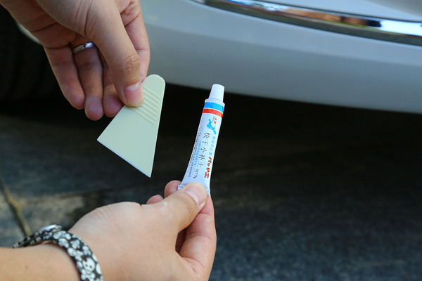 可以看到這輛車的劃痕傷至底漆了,為了更好的固漆,我們需要進(jìn)行簡單的補(bǔ)土或者叫打膩?zhàn)?,對凹凸不平之處也可以很好的找平。這種小管的補(bǔ)土很便宜,電商賣10元左右,而全套的補(bǔ)漆工具不足百元。
